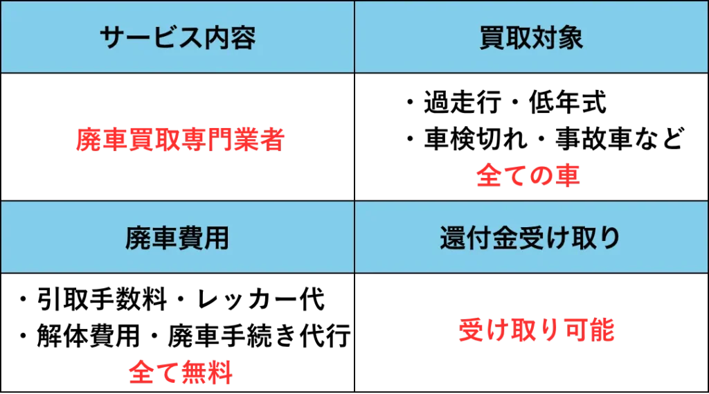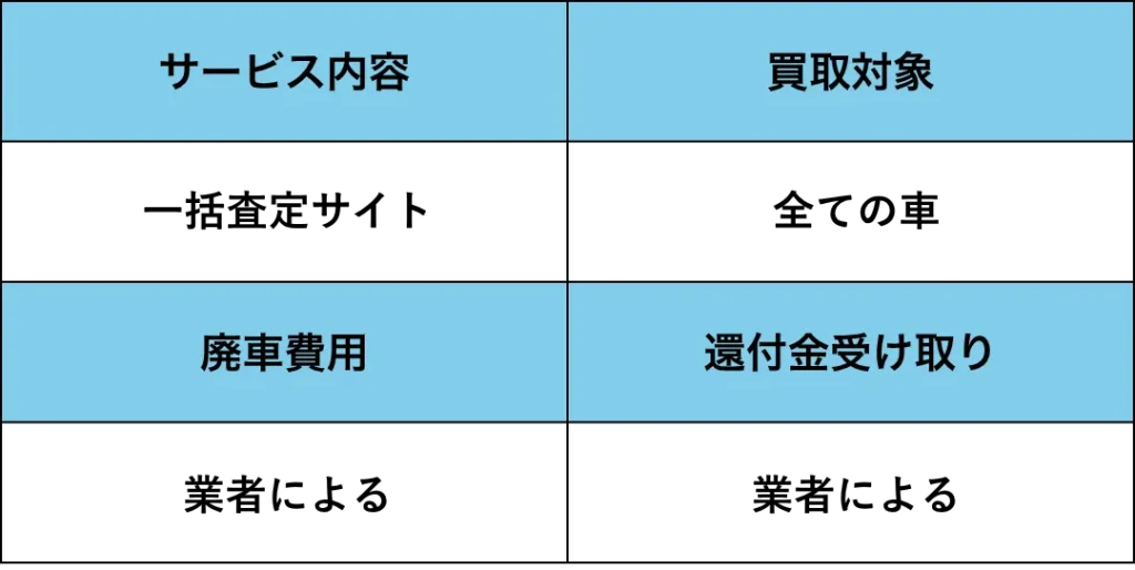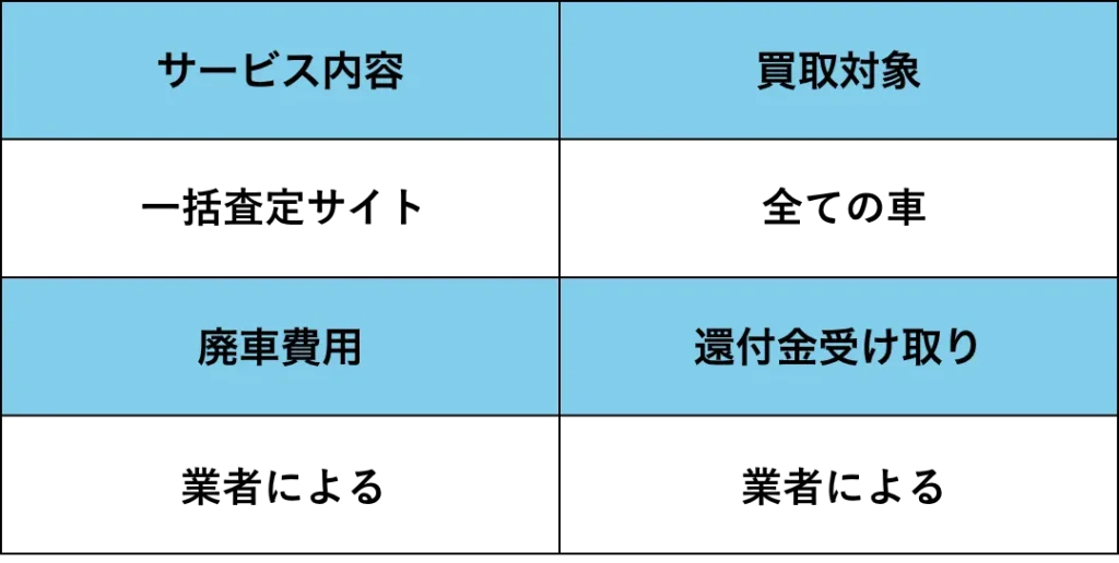 | サービス内容 廃車買取専門 | サービス内容 一括査定 | サービス内容 一括査定 |