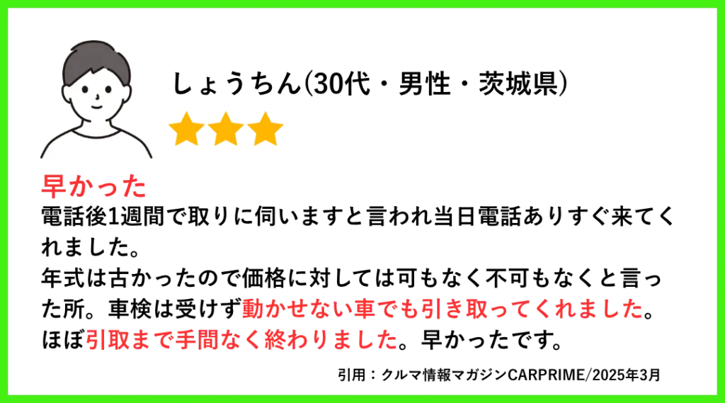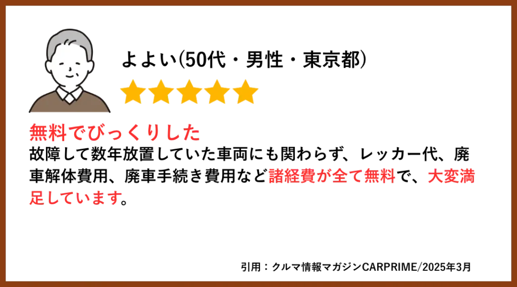 年式や状態を問わず、あらゆる車でも売却可能なだけでなく、引取手数料・レッカー代・解体費用・廃車手続きもすべて無料なので、手間なく売却できます。
