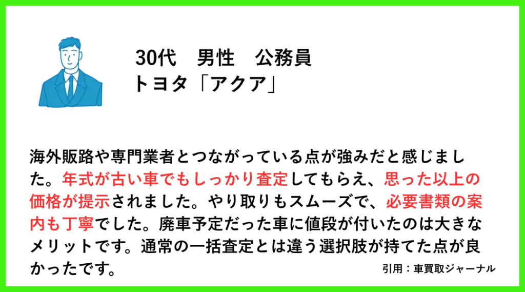 国内では値がつかないような車でも、「0円以上の買取」を目標に査定してくれます。